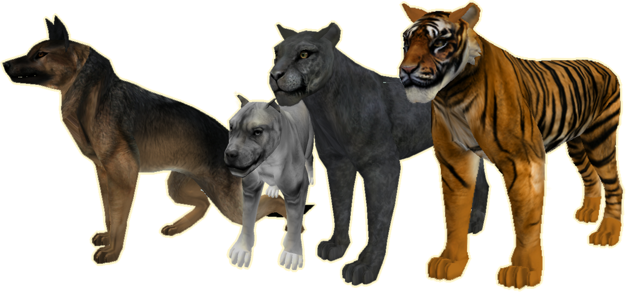 very wip gsd - missing textures and more (personal), also very wip pit bull texture (commission), black leopard w missing tail and some missing details (personal), sumatran tiger w missing tail and lots of unfinished details (personal)